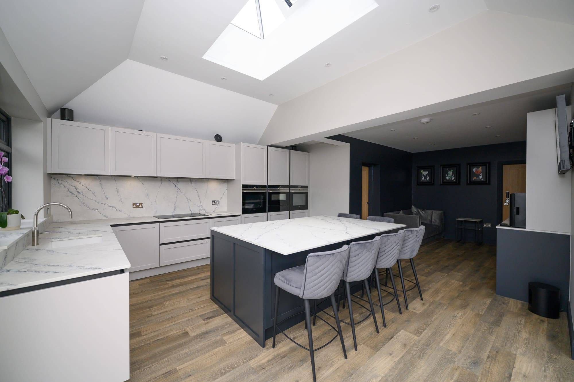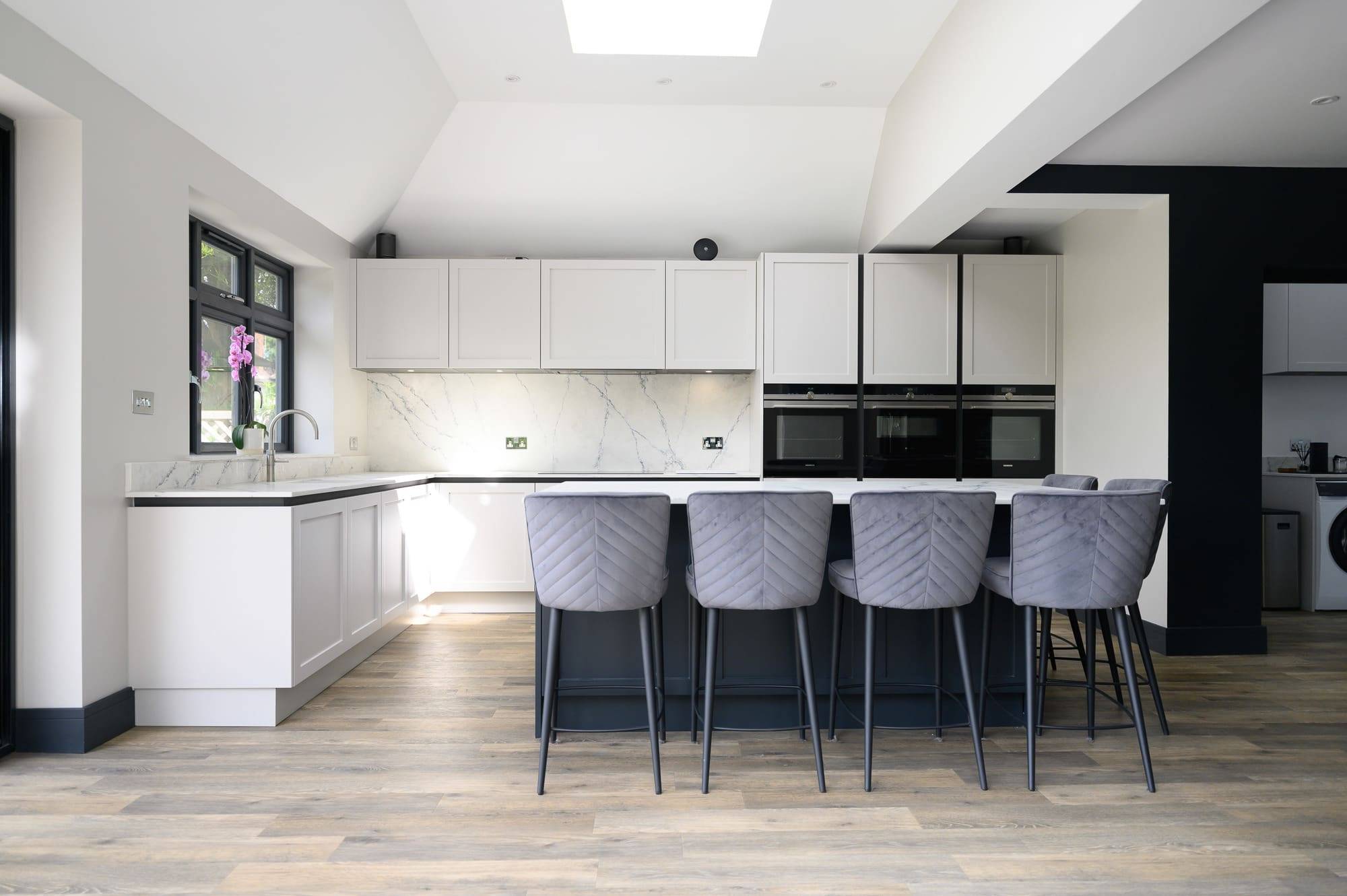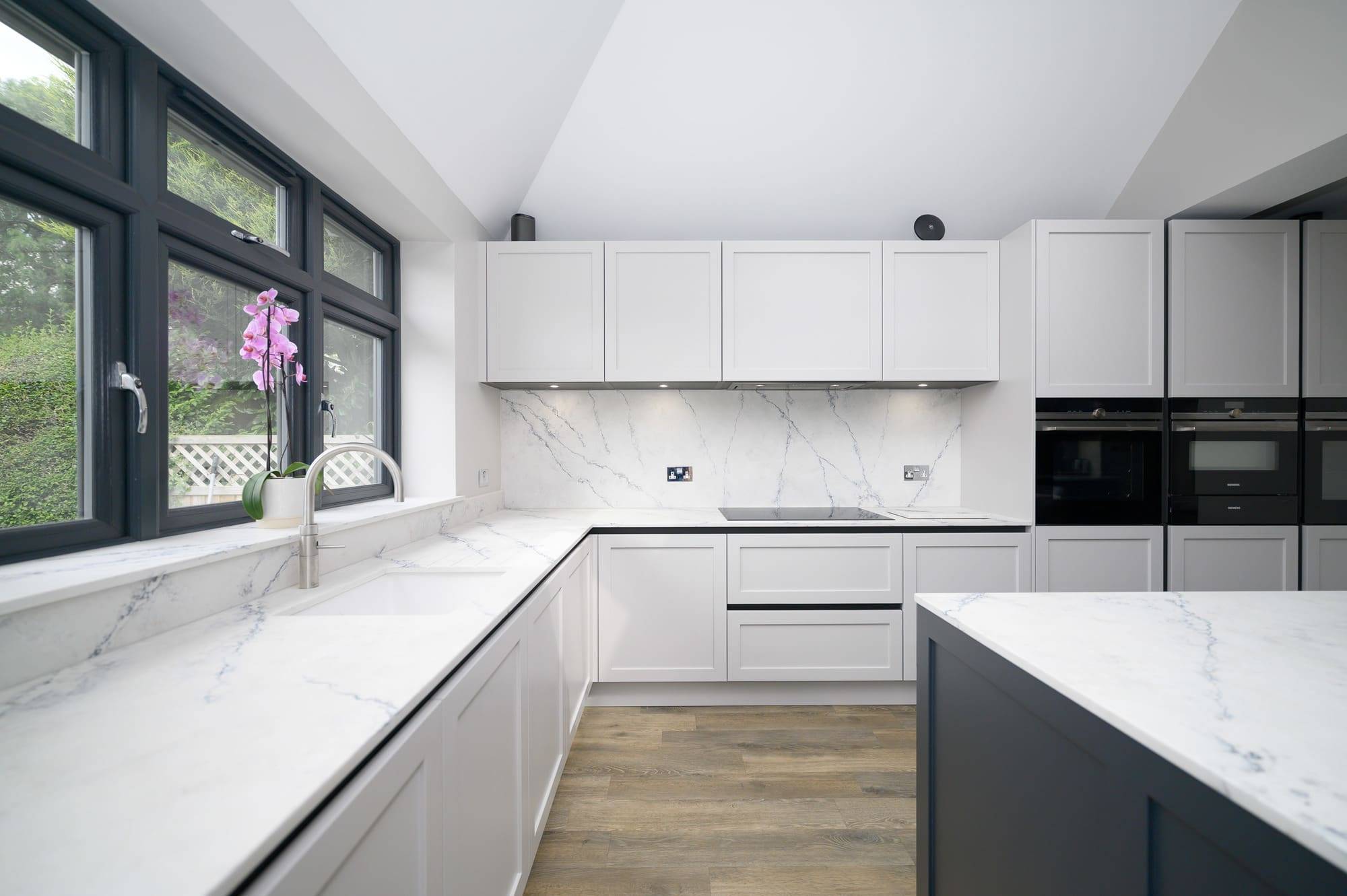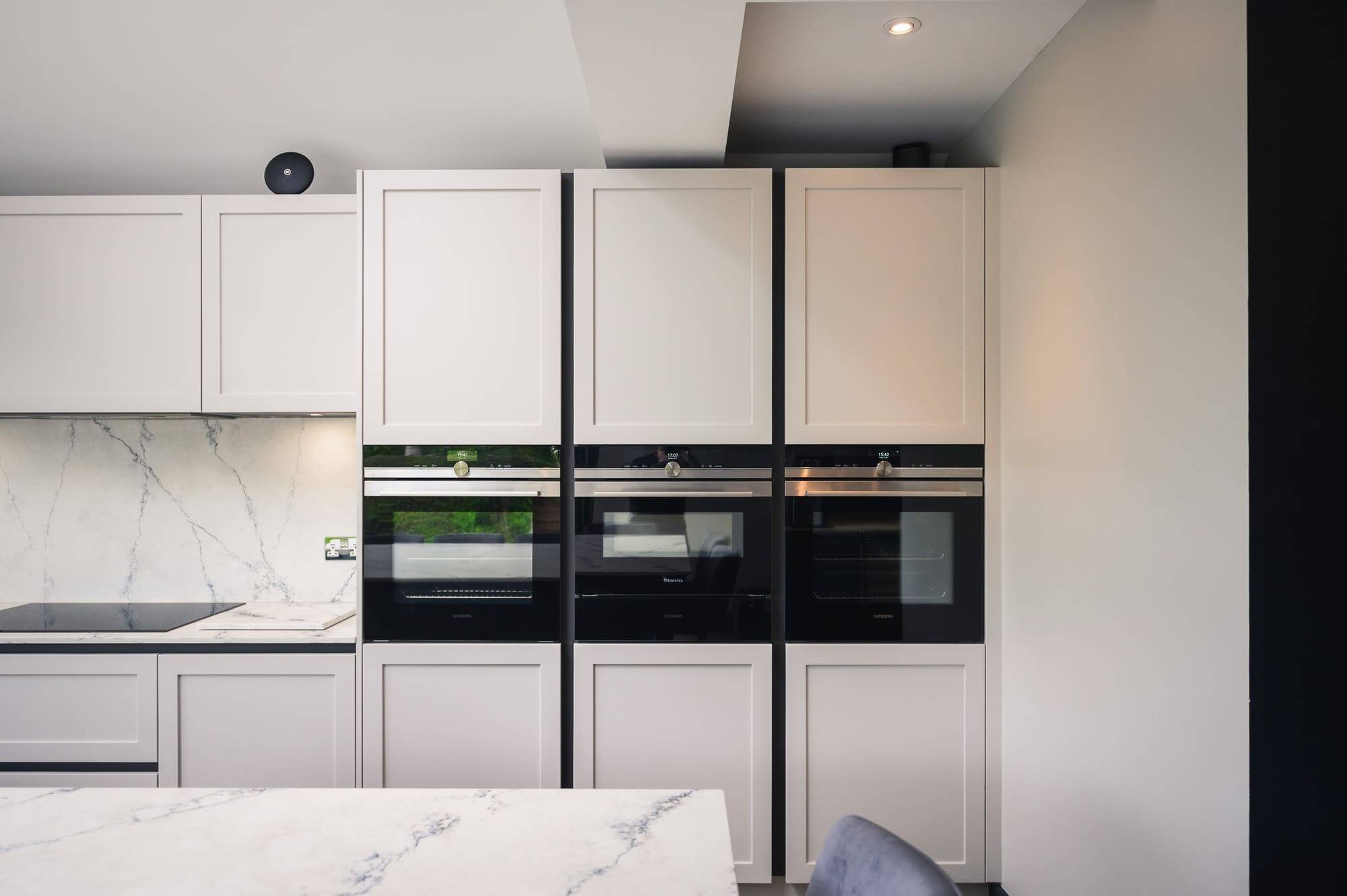 Our team carefully designed, supplied, and installed not just the kitchen but also a utility room, a dedicated drinks area, and a spacious walk-in pantry, tailoring each space to meet the needs of the household. We installed 20mm thick Expressions Santorini worktops, known for their durability and sleek appearance, complementing the overall aesthetic of the kitchen. A full range of high-end appliances from Siemens, Bosch, Samsung, and Caple was supplied by us, ensuring that the kitchen was equipped with the latest technology. This kitchen also includes a Quooker hot tap that provides instant boiling water, adding convenience to this family kitchen.