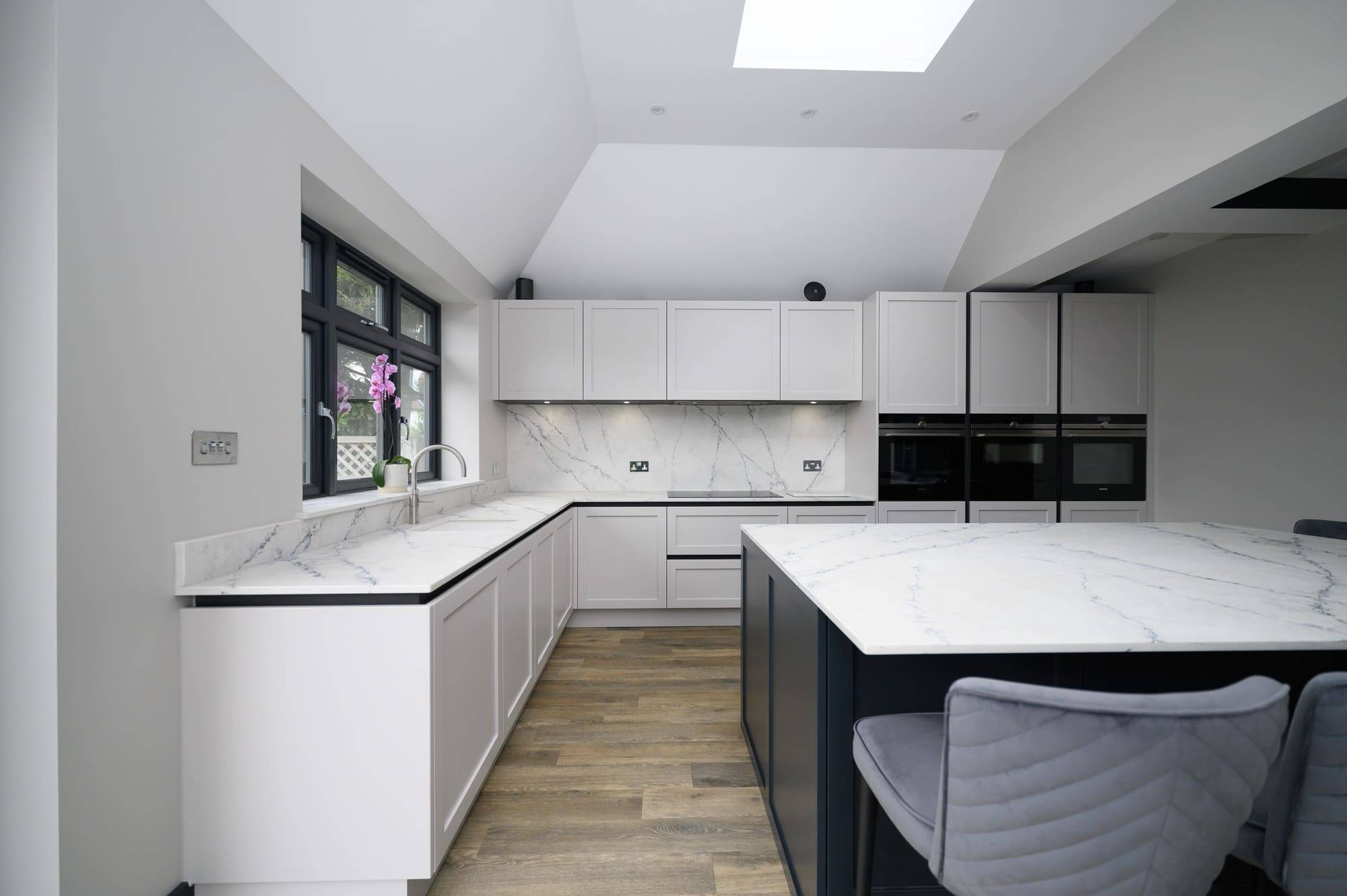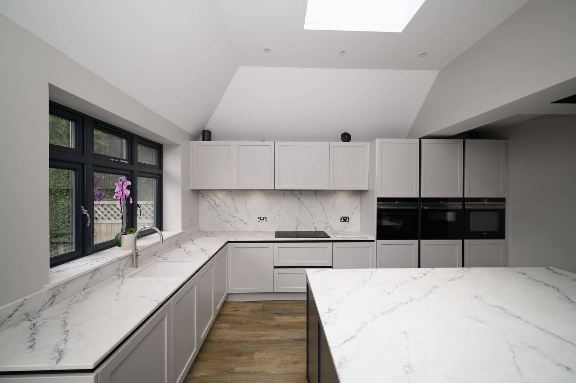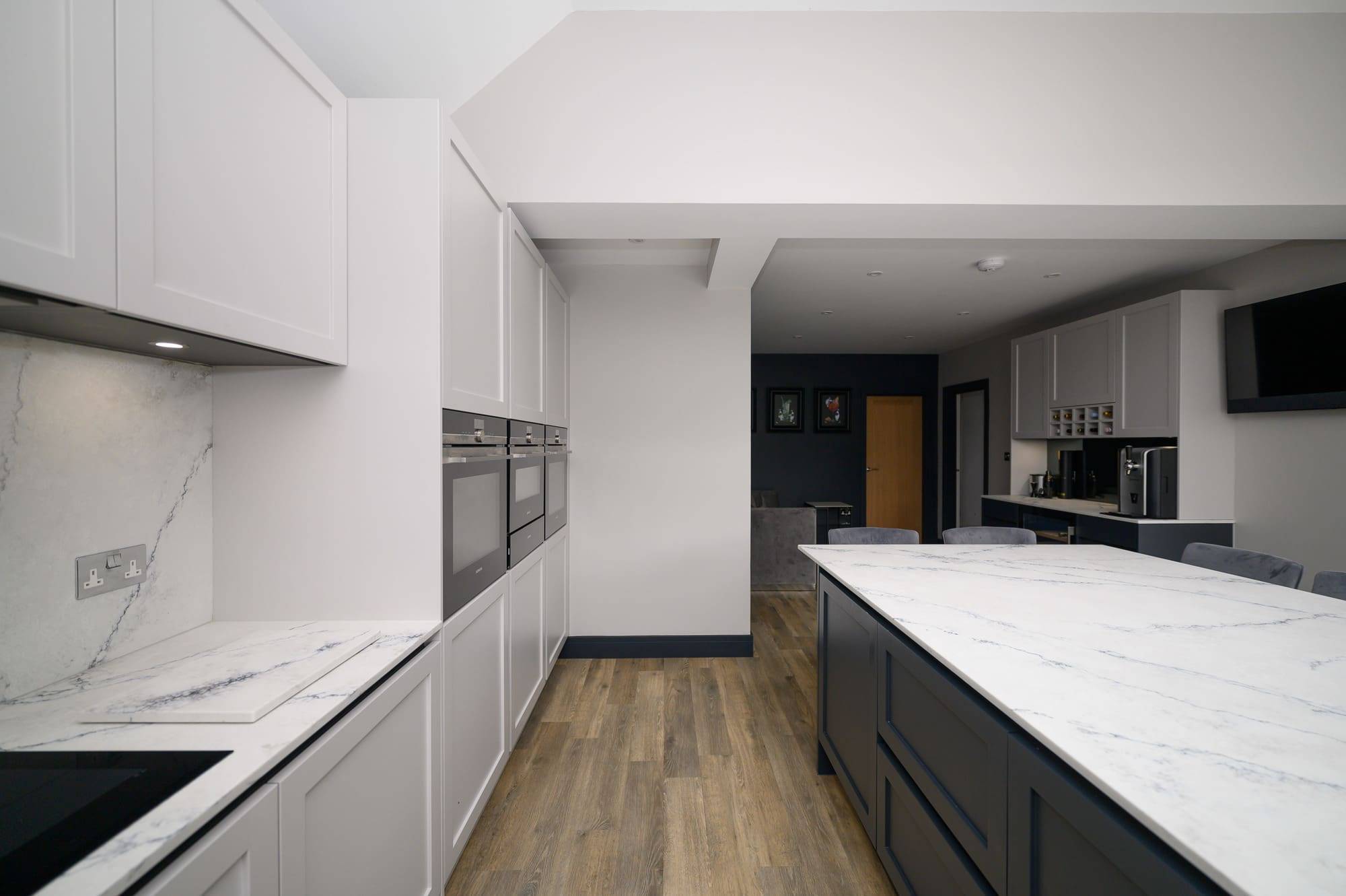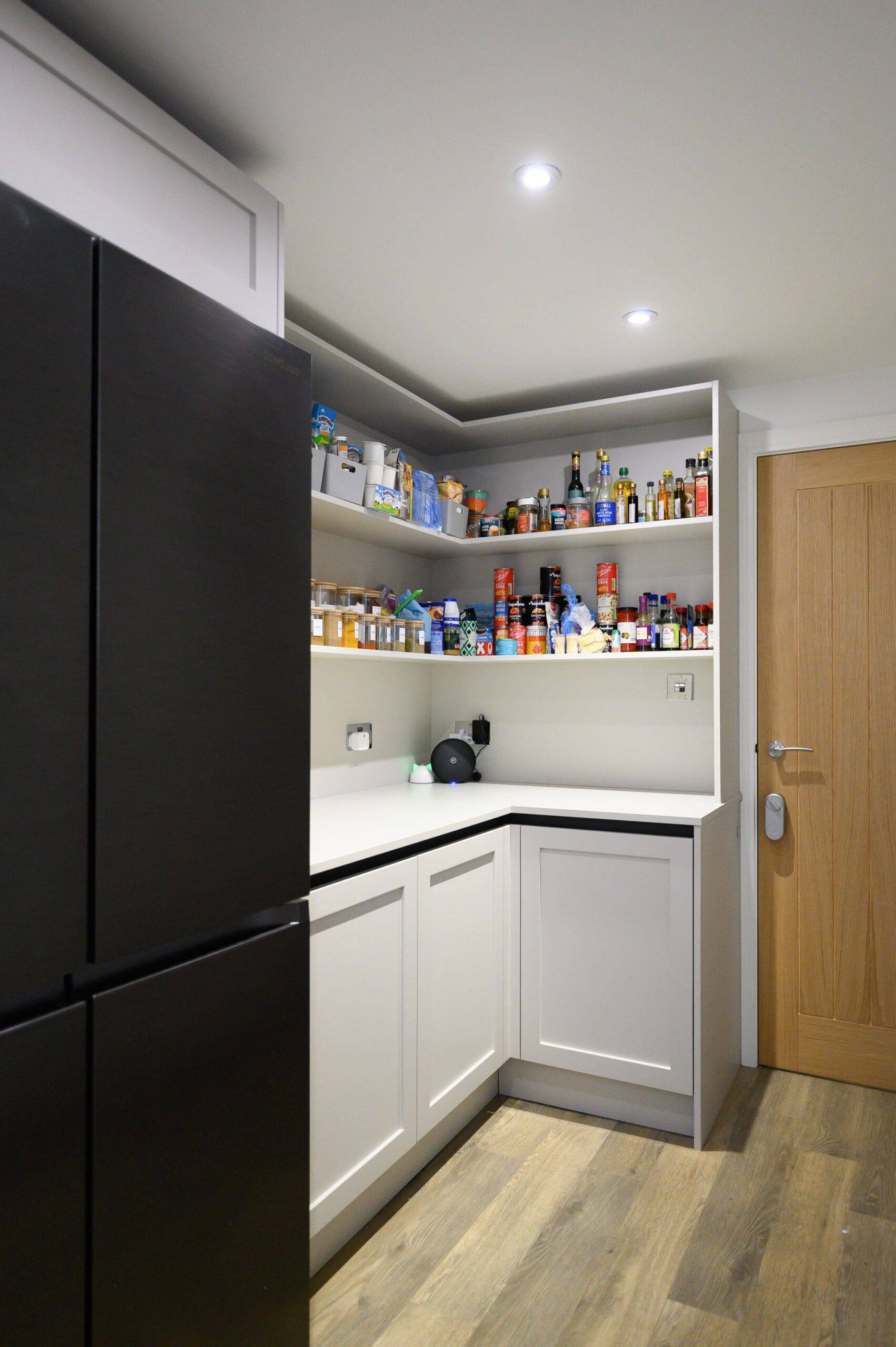 Our team carefully designed, supplied, and installed not just the kitchen but also a utility room, a dedicated drinks area, and a spacious walk-in pantry, tailoring each space to meet the needs of the household. We installed 20mm thick Expressions Santorini worktops, known for their durability and sleek appearance, complementing the overall aesthetic of the kitchen. A full range of high-end appliances from Siemens, Bosch, Samsung, and Caple was supplied by us, ensuring that the kitchen was equipped with the latest technology. This kitchen also includes a Quooker hot tap that provides instant boiling water, adding convenience to this family kitchen.