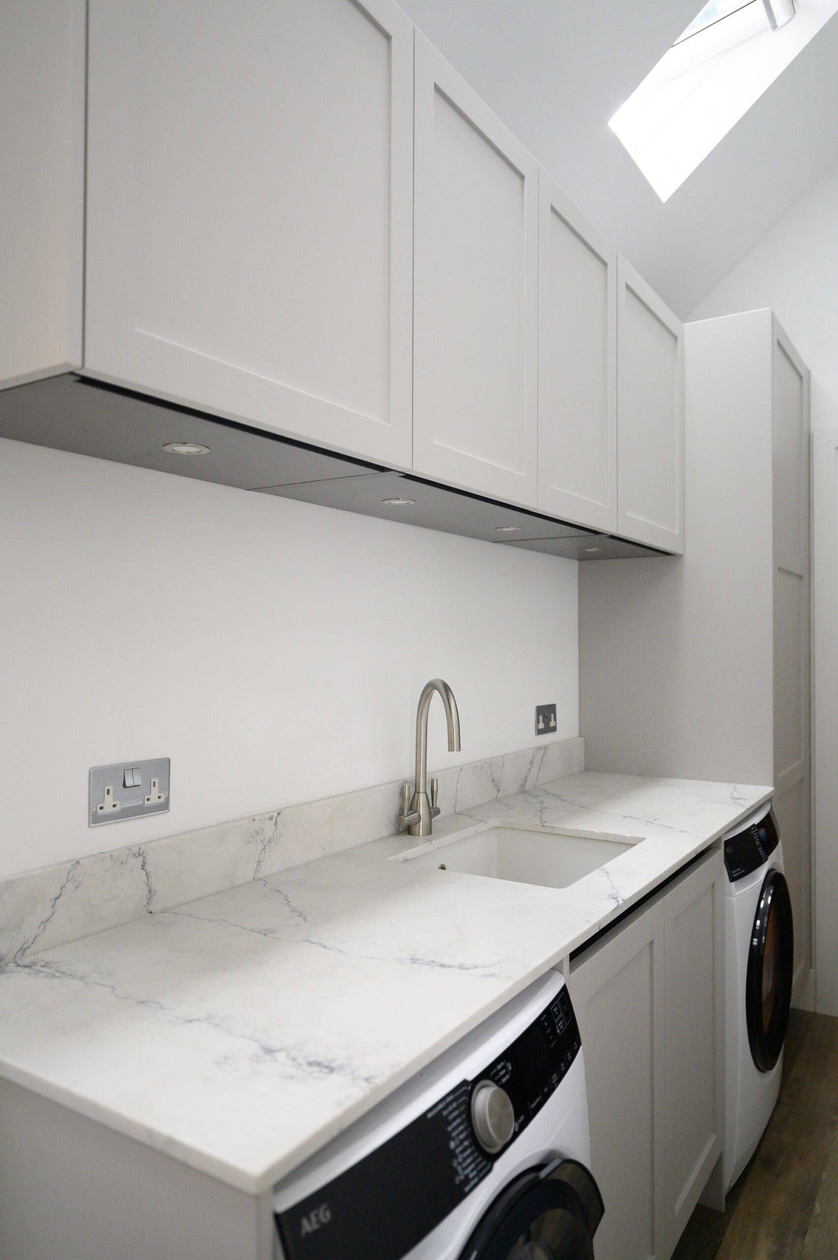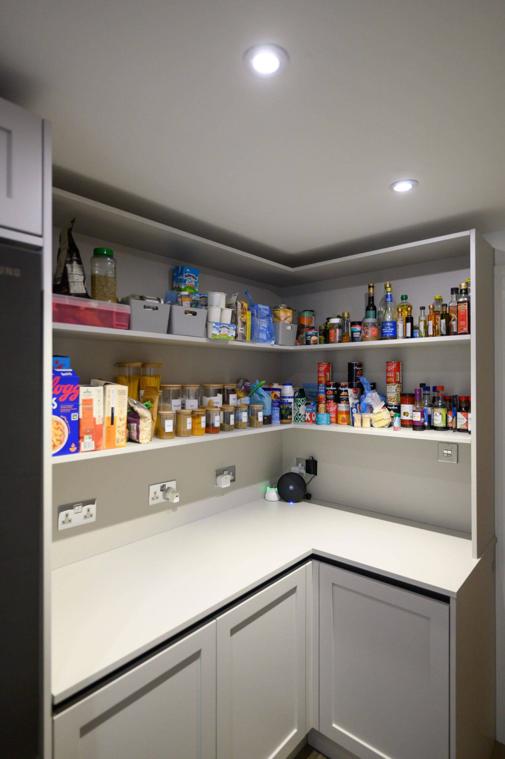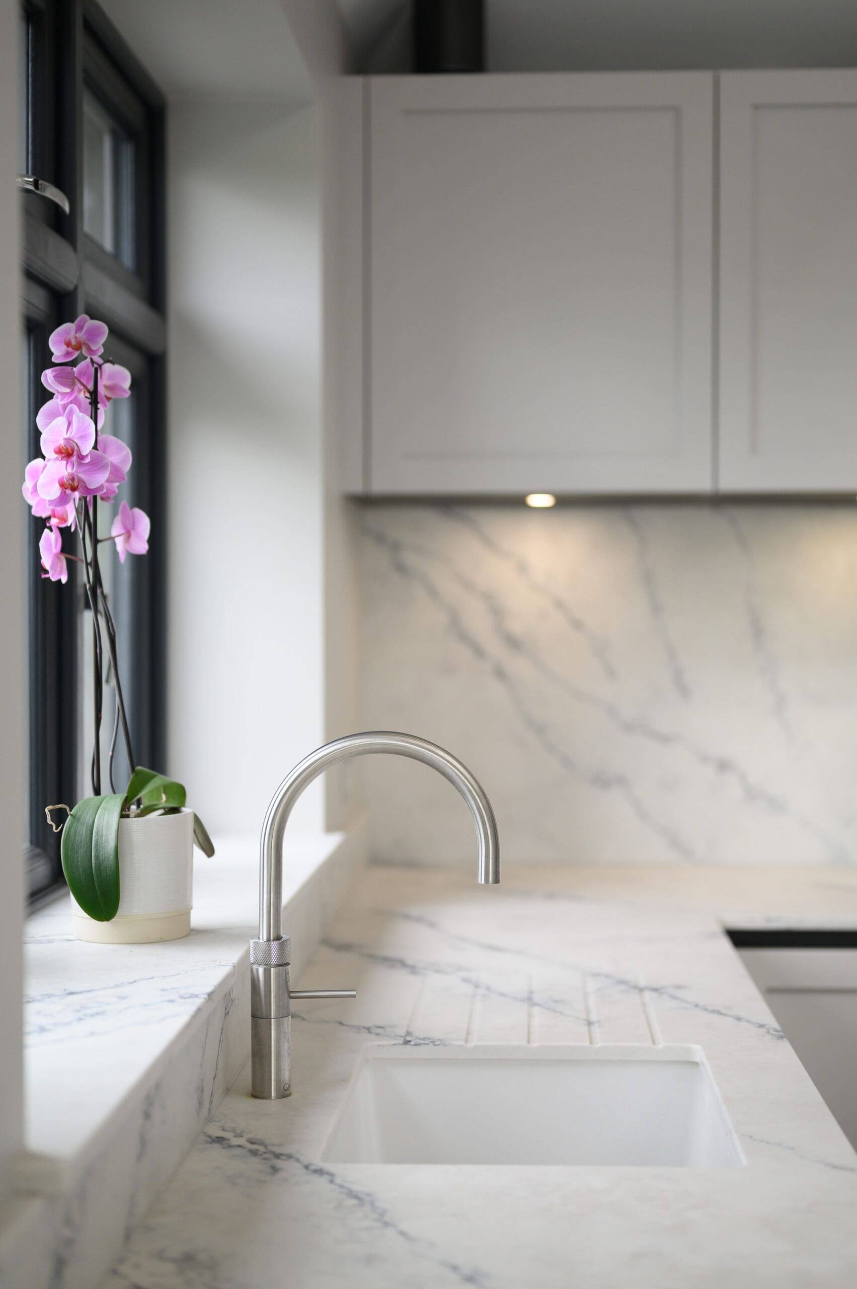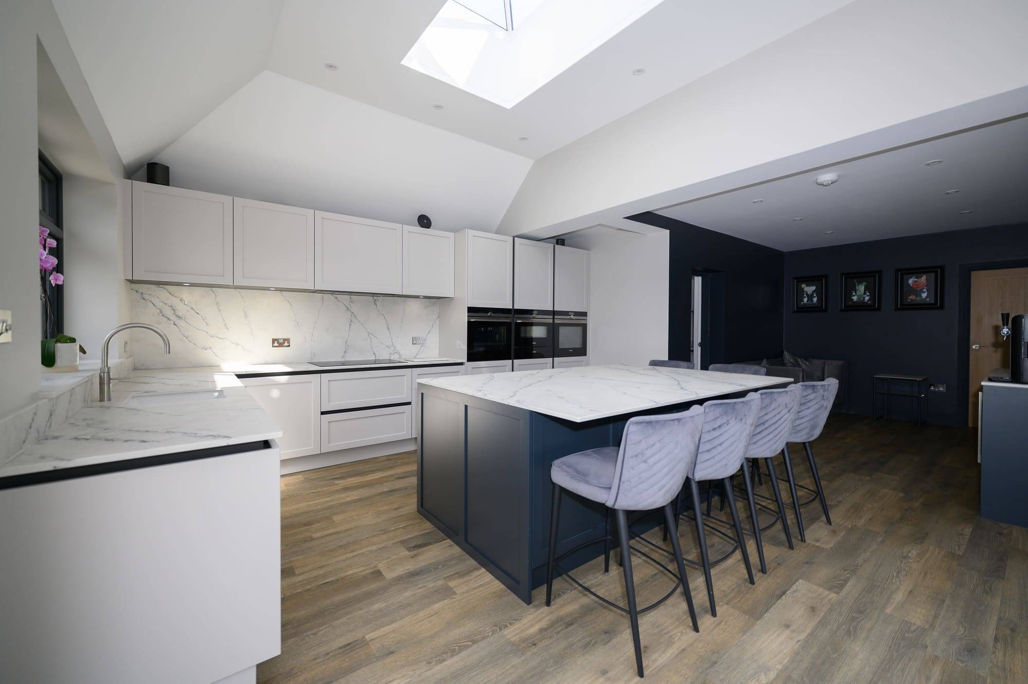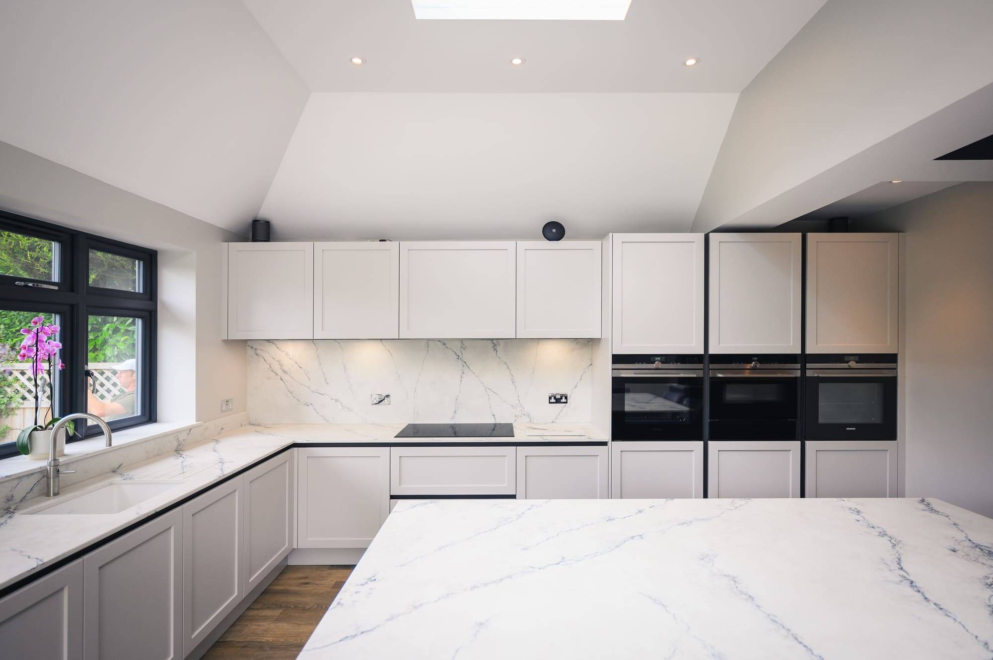 Our team carefully designed, supplied, and installed not just the kitchen but also a utility room, a dedicated drinks area, and a spacious walk-in pantry, tailoring each space to meet the needs of the household. We installed 20mm thick Expressions Santorini worktops, known for their durability and sleek appearance, complementing the overall aesthetic of the kitchen. A full range of high-end appliances from Siemens, Bosch, Samsung, and Caple was supplied by us, ensuring that the kitchen was equipped with the latest technology. This kitchen also includes a Quooker hot tap that provides instant boiling water, adding convenience to this family kitchen.