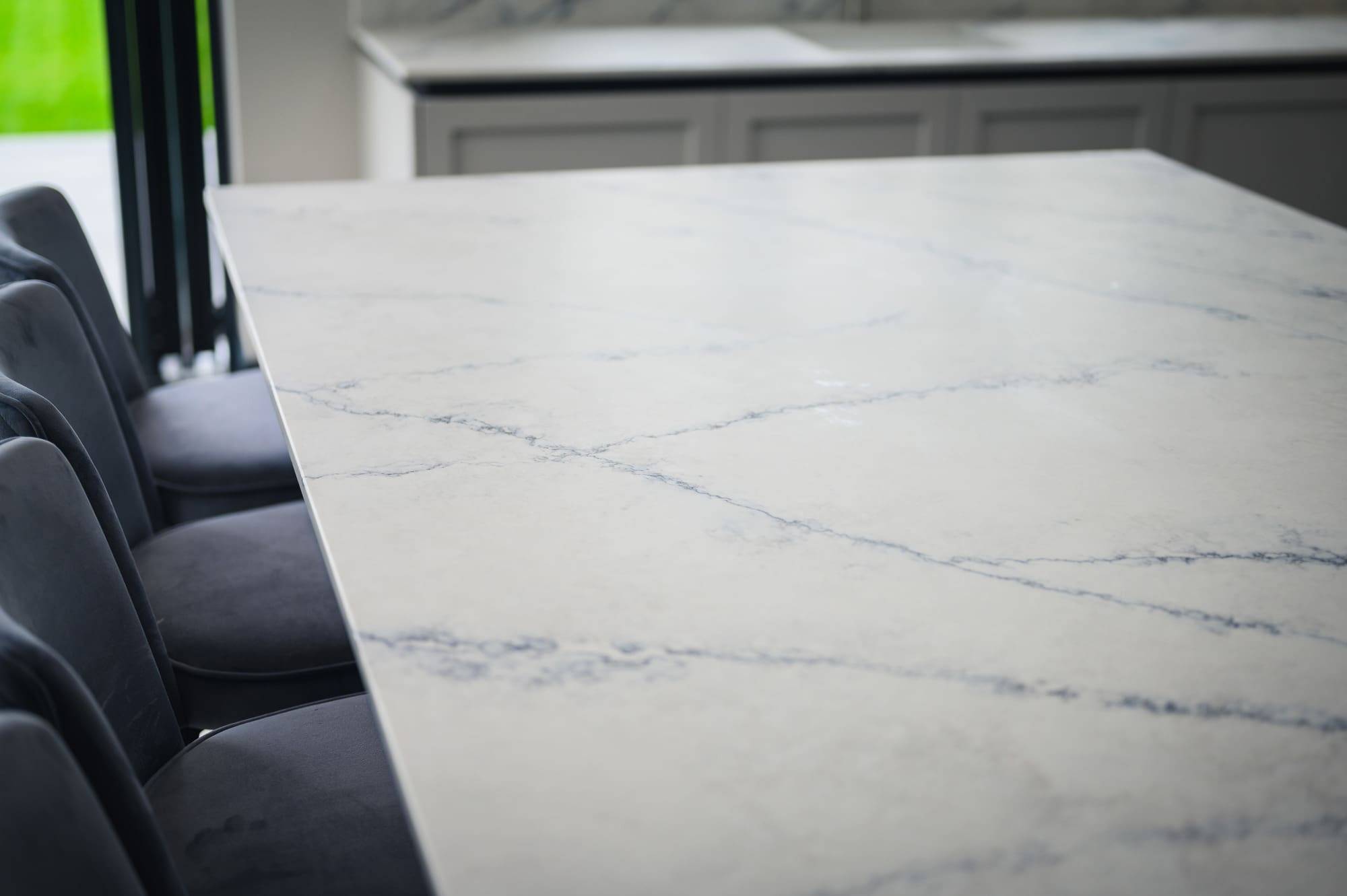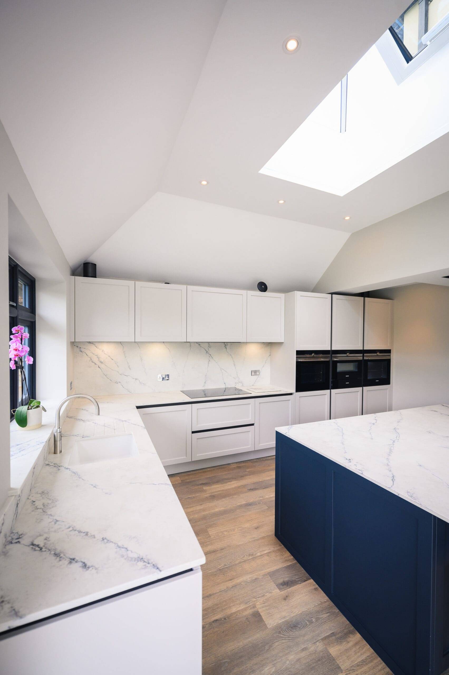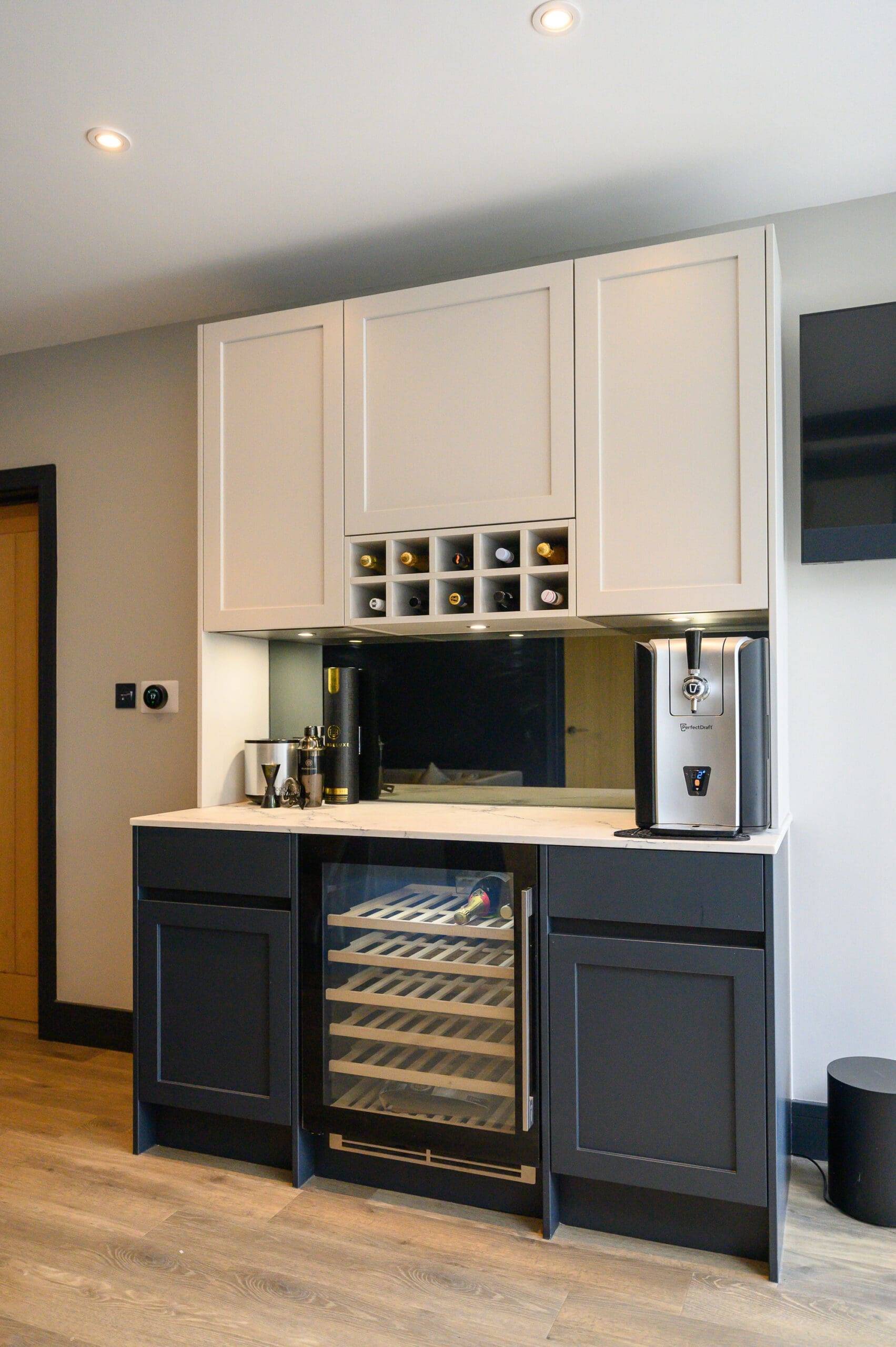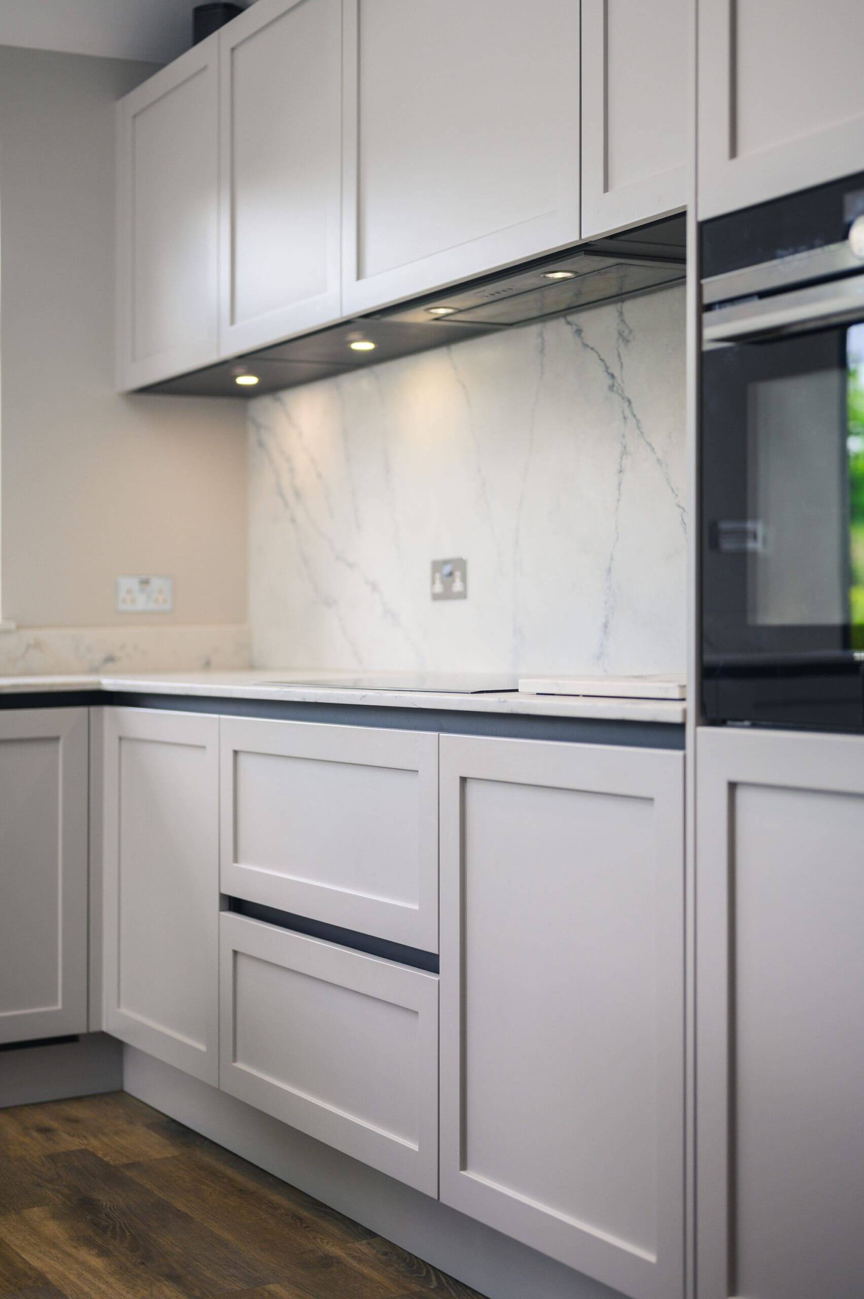 Our team carefully designed, supplied, and installed not just the kitchen but also a utility room, a dedicated drinks area, and a spacious walk-in pantry, tailoring each space to meet the needs of the household. We installed 20mm thick Expressions Santorini worktops, known for their durability and sleek appearance, complementing the overall aesthetic of the kitchen. A full range of high-end appliances from Siemens, Bosch, Samsung, and Caple was supplied by us, ensuring that the kitchen was equipped with the latest technology. This kitchen also includes a Quooker hot tap that provides instant boiling water, adding convenience to this family kitchen.