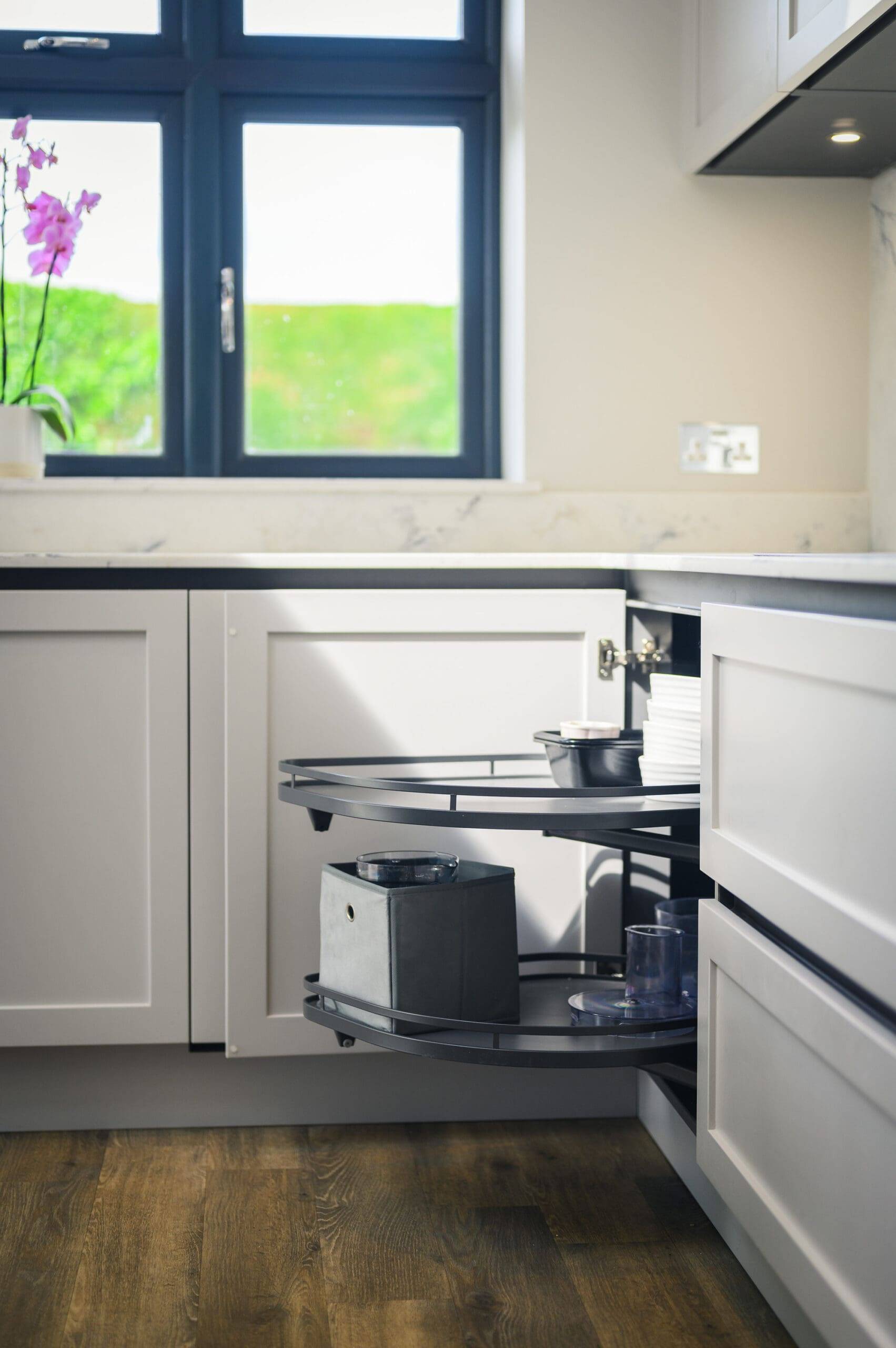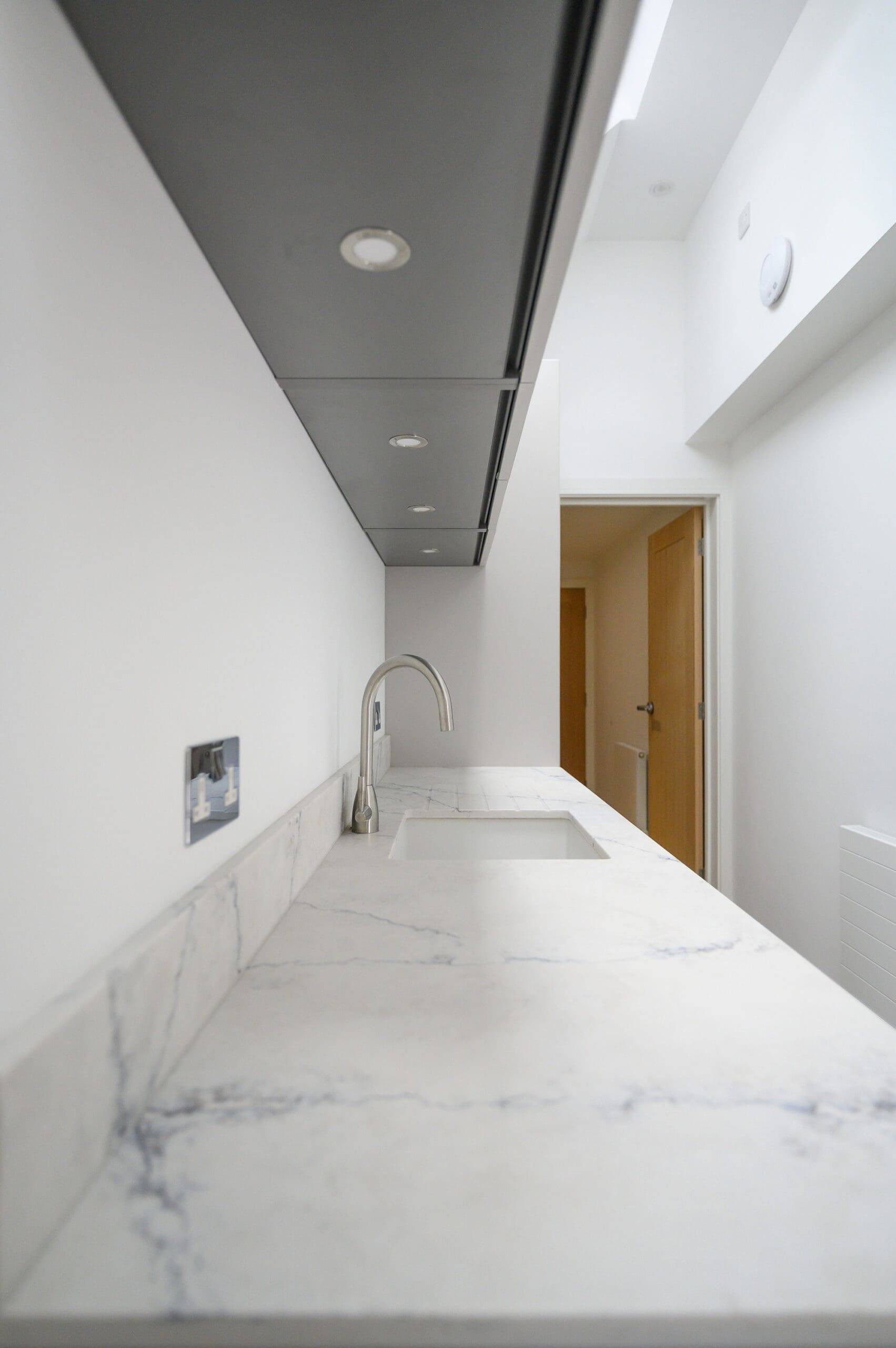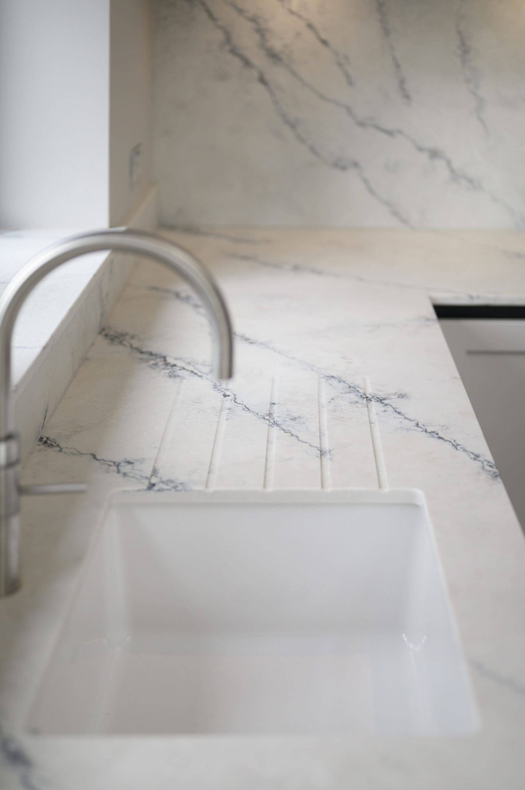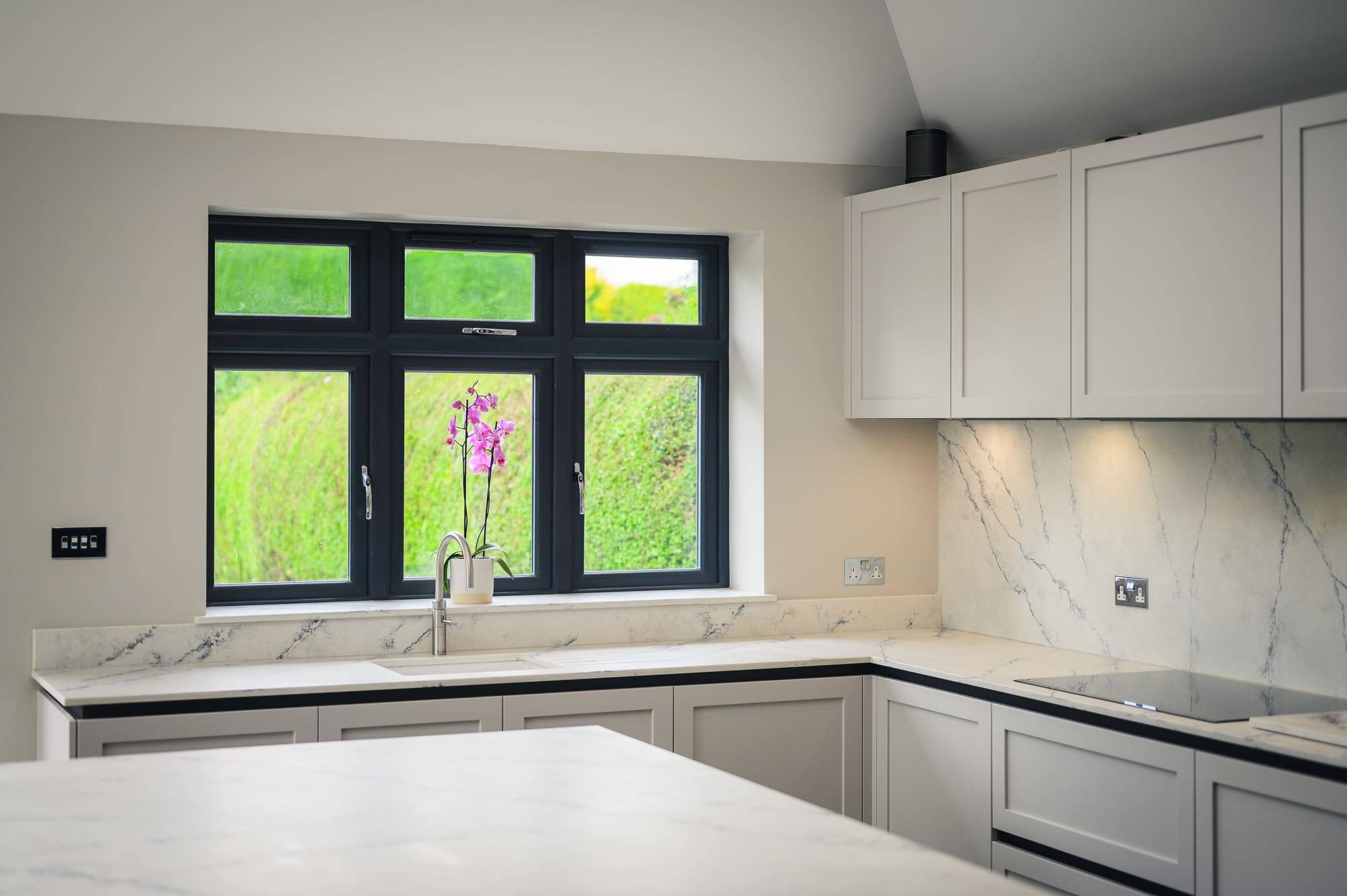 Our team carefully designed, supplied, and installed not just the kitchen but also a utility room, a dedicated drinks area, and a spacious walk-in pantry, tailoring each space to meet the needs of the household. We installed 20mm thick Expressions Santorini worktops, known for their durability and sleek appearance, complementing the overall aesthetic of the kitchen. A full range of high-end appliances from Siemens, Bosch, Samsung, and Caple was supplied by us, ensuring that the kitchen was equipped with the latest technology. This kitchen also includes a Quooker hot tap that provides instant boiling water, adding convenience to this family kitchen.